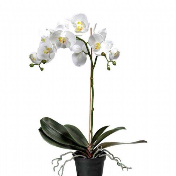Denne kunstige orkide i potte, er med 2 grene og er en af vores bestsellere. Planten er meget naturtro og nem at holde og kræver ingen vand og pleje. Fordelen ved kunstige orkideer er, at de kan stå alle steder og blomstrer året rundt. Potteplanten har en god størrelse til vindueskarmen i boligen, sommerhuset eller i kontormiljøet. Silkeplanten er 100 % allergivenlig og kan rengøres med vand eller brug en føntørrer hvis det kun er støv.
